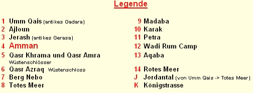 Ajloun 25 km westlich von Jerash liegt das Städtchen Ajlun (20'000 Einw.), das berühmt ist für seine Burg, die ausserhalb der Stadt auf einem Berggipfel liegt. Die von einem General und Neffen des arabischen Feldherrn Salah ed-Din 1184/85 erbaute Burg ist eines der schönsten Beispiele der islamischen Militärarchitektur im Mittleren Osten. Trotz ihrer fast uneinnehmbaren Lage stürmten die Mongolen 1260 die Burg und plünderten sie. Die Mamelucken banden sie in eine Kette von Burgen und Posten ein, die es ermöglichte, innerhalb von zwölf Stunden per Lichtzeichen oder Brieftaube Nachrichten von Kairo bis nach Damaskus oder nach Bagdad zu senden. Die Ruinen von Jerash, dem antiken Gerasa, gelten als die weltweit besterhaltene römische Siedlung. Nach Petra sind sie die zweitwichtigste Attraktion für Touristen in Jordanien. Die Sehenswürdigkeit liegt etwa 50 km nördlich von Amman und kann gut auf einem Tagesausflug von Amman aus besucht werden. Die aus rosa-oerangefargenem Kalkstein erbaute Stadt lag an einer der wichtigsten Handelsrouten der Antike. Ihre Blütezeit erlebte die hellenistische Stadt jedoch unter römischer Herrschaft im 2. und 3. Jh., als sie zum Städtebund der Dekapolis gehörte. Der Besuch von Kaiser Hadrian 129 n.Chr. führte zu einem grossen Bauboom, die Stadt wurde zum Wirtschaftszentrum der Provincia Arabica. Sie lag an der neuen Via Romana, einem gepflasterten Weg, der Aqaba mit Damaskus verband. Zu seinen Glanzzeiten lebten 20'000 Menschen in dem antiken Gerasa. Unter byzantischer Herrschaft begann der Verfall, und im 9. Jh. wurde die Stadt von den letzten Einwohnern verlassen. Doch in jedem Sommer wird sie zu neuem Leben erweckt: In den beiden Theatern werden Opern gespielt und Konzerte gegeben. Das Faszinierende an Jerash ist der gute Zustand der Bauwerke. Zu verdanken ist dies dem relativ trockenen Klima und der Tatsache, dass die Islamisierung der Region relativ friedlich verlief und die neuen Herrscher die vorhanene Architektur weitgehend intakt liessen. Allerdings bauten die Byzantiner die Stadt stark um, insbesondere die Kultorte. |