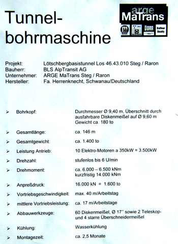 Im vorderen Teil der Maschine erfolgt die Felssicherung mit Ankern, Baustahlmatten und Spritzbeton. Hierzu sind auf der Maschine diverse Bohr- und Spritzeinrichtungen installiert. Im hinteren Teil der Maschine, den Nachläufern, erfolgt der Umschlag der Baumaterialien, die mit einer Stollenbahn angeliefert werden. Zu diesem Zweck wird im Sohlbereich ein Beton-Fertigteil, ein sogenannter Tübbing verlegt. Auf diesem Tübbing werden dann die Gleise installiert. |
